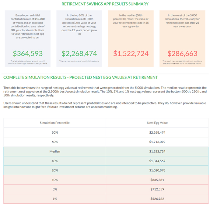 If you would like to take your retirement accumulation planning one step further, feel free to play with our proprietary Nest Egg Guru Retirement Savings app. It allows you quickly and easily test different basic variables that are within your control (e.g., your savings rate, your investment allocation, your years until retirement, etc). Based upon your inputs, the results will give you a realistic range of how much you will have at retirement. We encourage you to focus on the bottom half of the simulation results so that you can see how much you may have if investment returns are normal, to below average to downright awful between now and when you expect to retire. An example of how the output is presented is provided below: