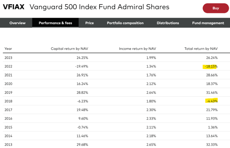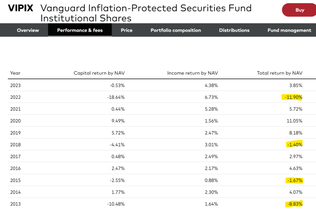 Now, I understand that comparing the performance of a large-cap U.S. stock fund to a TIPS fund is like comparing apples to oranges, but how is it that the fund that invests in “The Safest Investment” has had four negative return years since 2013, while the “risky” stock fund has had only two?